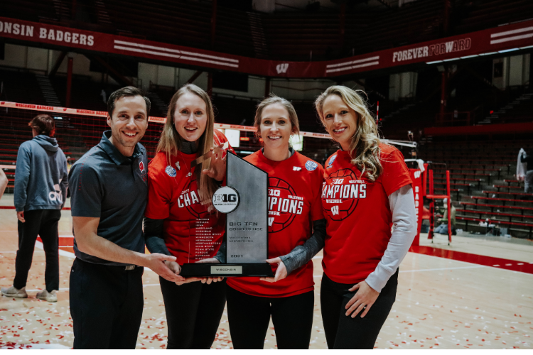 From left to right: Gary White, Jessica Williams, Annemarie Hickey and Brittany Dildine celebrating the 2021 Big Ten title. (Photo courtesy of Wisconsin Athletics)